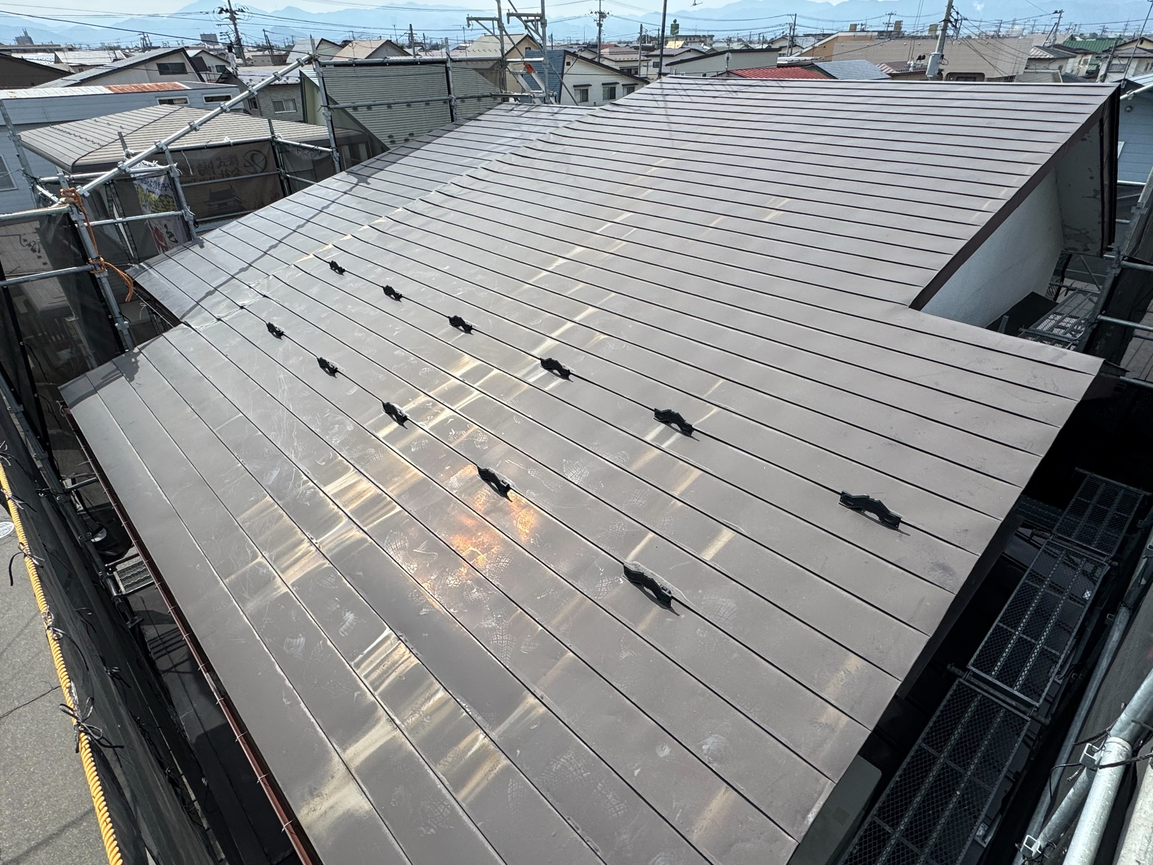 勾配が緩い場合でも雨漏りに強い、立平屋根で施工させていただきました。